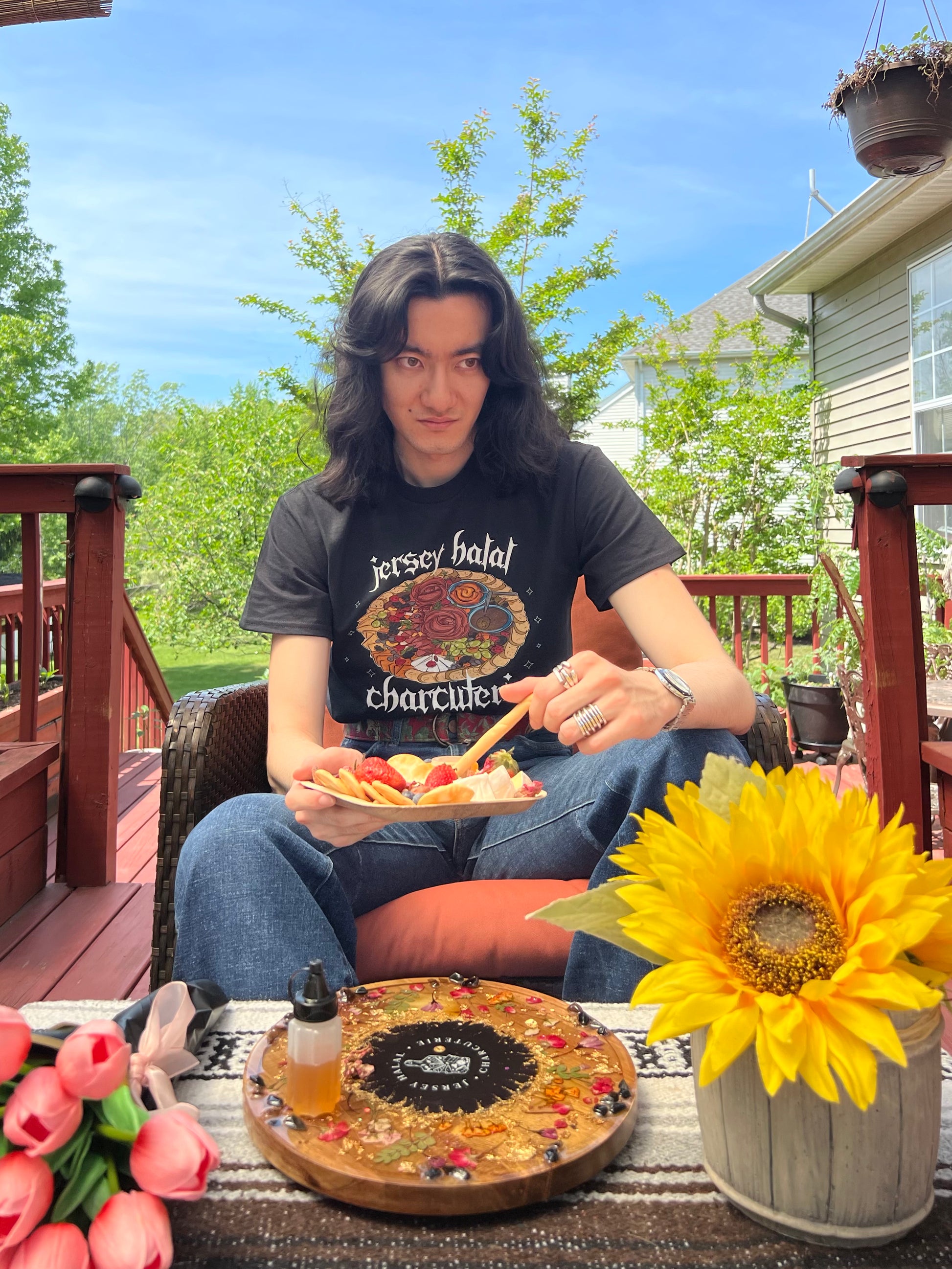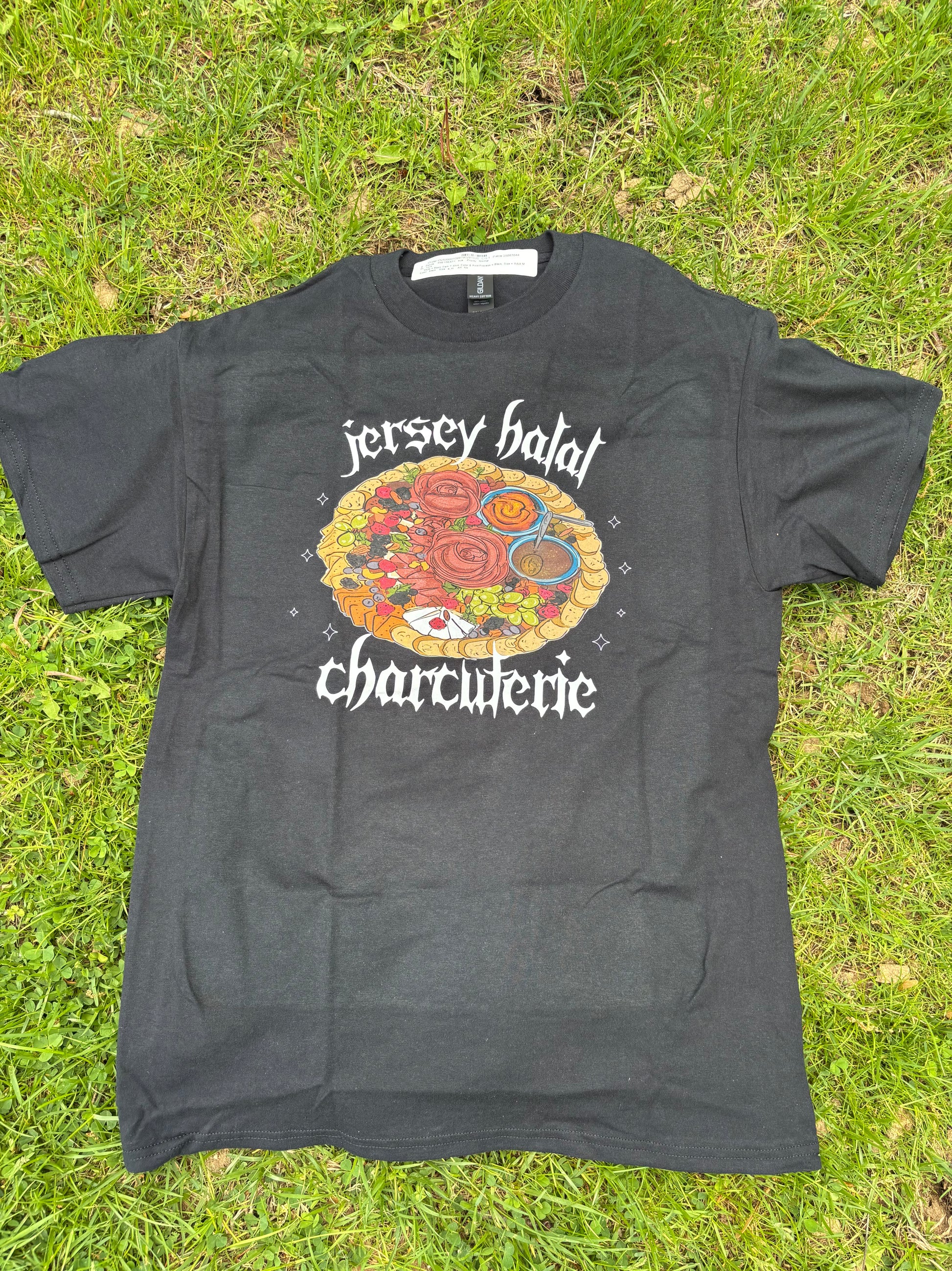 Bring the board to the streets with our signature Halal Bites & Bold Vibes tee. Featuring a vibrant, illustrated charcuterie spread front and center, this shirt celebrates everything Jersey Halal Charcuterie stands for—flavor, artistry, and unapologetic halal pride.